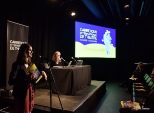 Un mot de bienvenue de Dominique Violette, directrice générale du Carrefour international de théâtre et de Marie Gignac, directrice artistique du Carrefour international de théâtre, suivi de Monsieur François Amyot le président du CA et de Mme Alicia Despins, membre du comité exécutif responsable de la culture, de la technoculture et des grands événements. On nous a présenté des petits vidéos pour nous donner un aperçu de ce qu’on aura le plaisir voir.